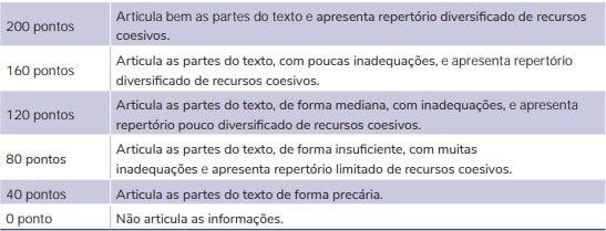 - O que é avaliado: O uso adequado de conectivos, marcadores discursivos e outros recursos linguísticos para garantir a coesão e a coerência do texto.