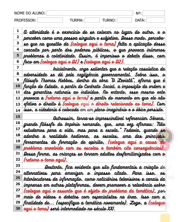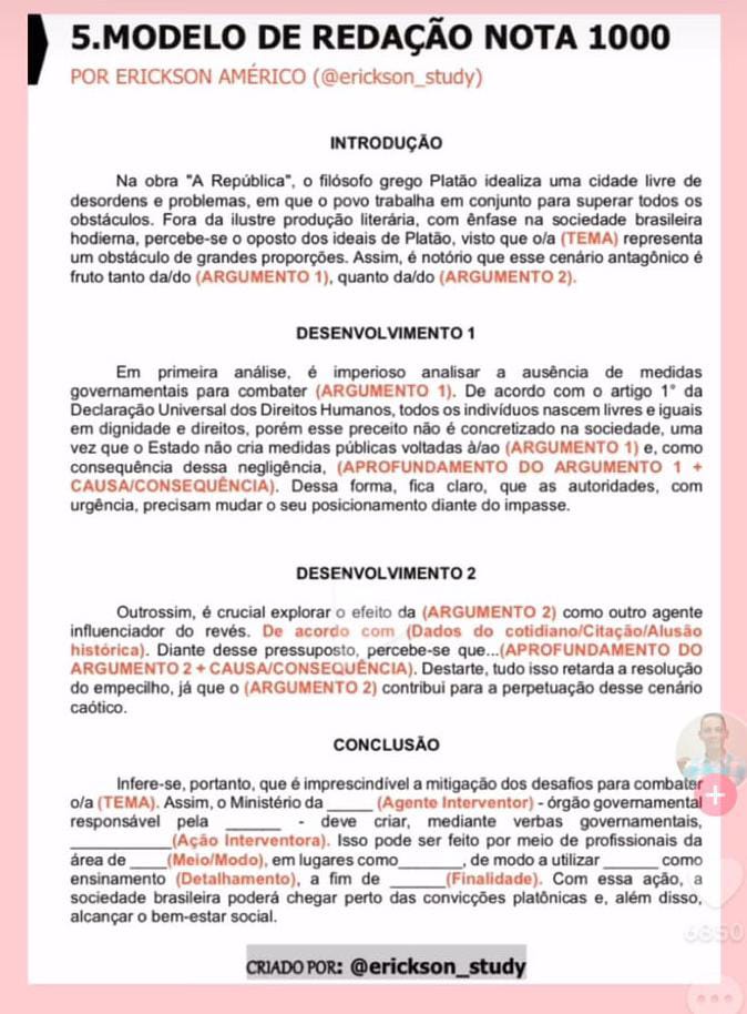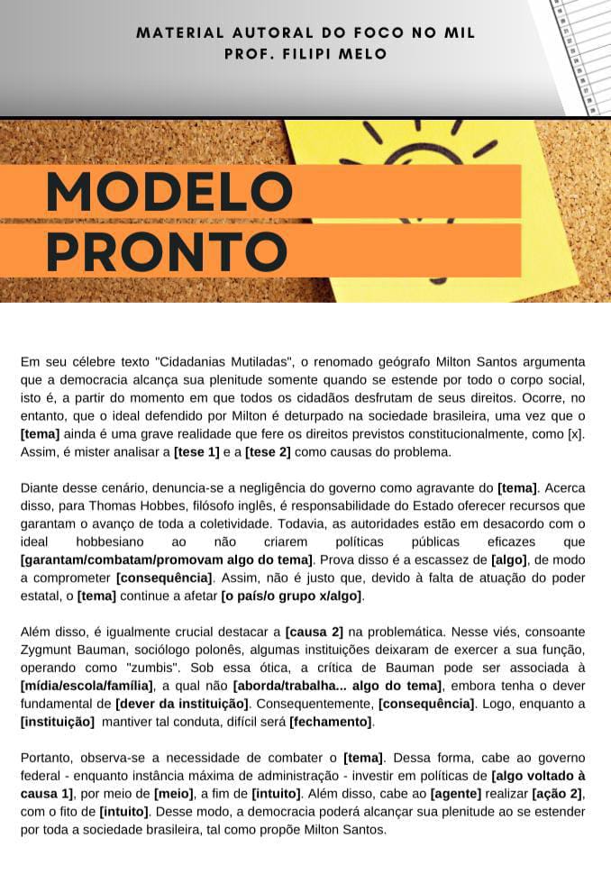 - Não é uma receita mágica: Um modelo pronto não garante a nota máxima. É preciso adaptar o modelo ao tema proposto e desenvolver uma argumentação própria;